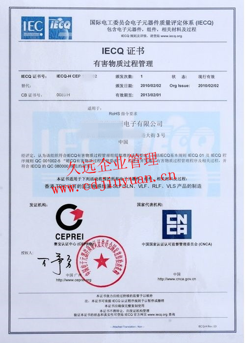 有害物質過程管理體系認證證書